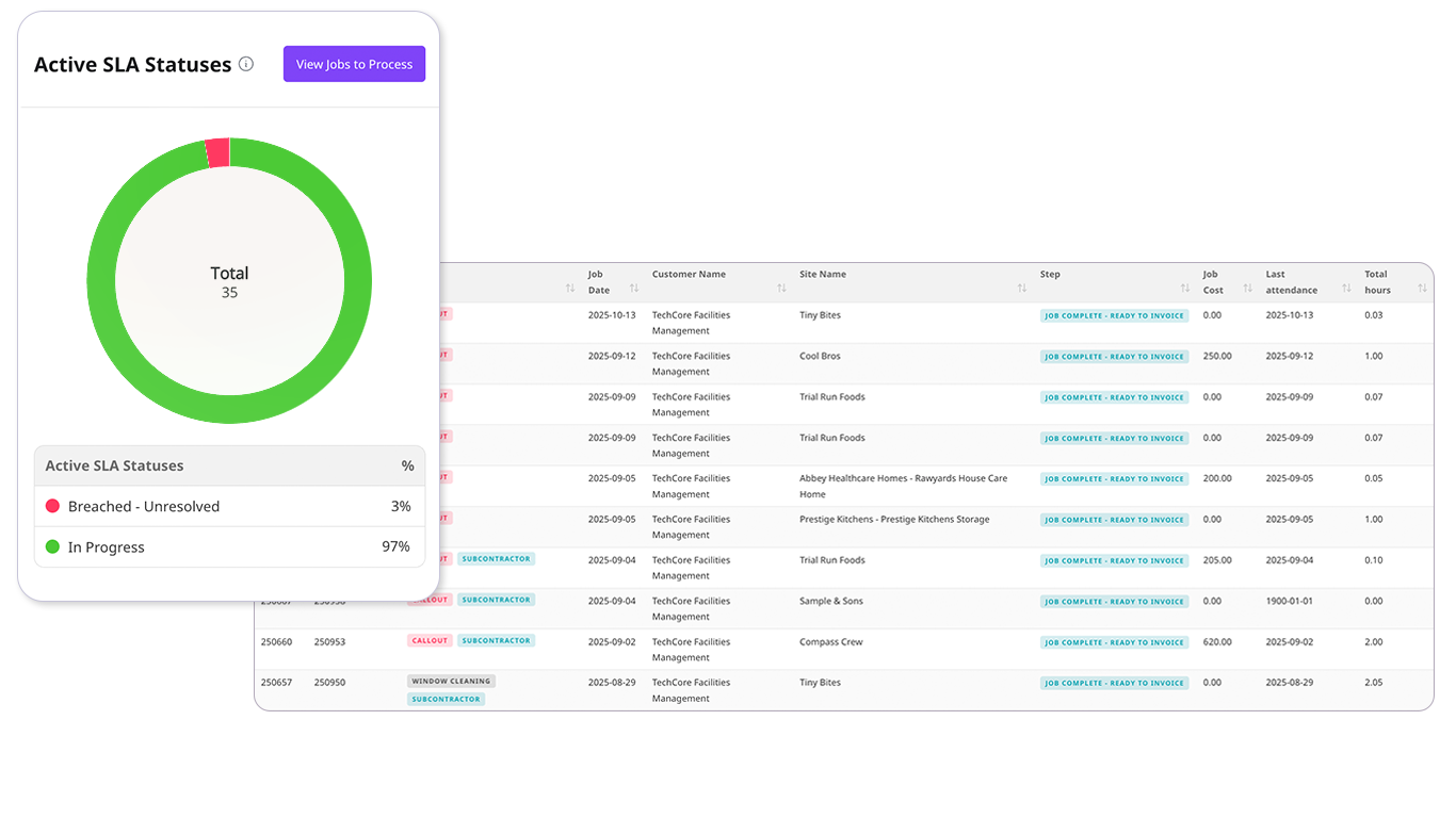 Live dashboards for operations, finance and compliance. Drill from headline KPIs to the underlying job.